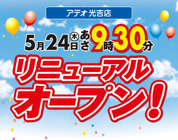 いつもアテオ光吉をご愛顧頂き誠にありがとうございます。 この度、リニューアルオープンをさせていただく運びとなりました。 新鮮な生鮮食品を中心とした安心・安全・健康・こだわり商品や、ライフスタイルにマッチした食材・お惣菜を提案し、特にワインコーナーはさらに充実の品揃えでお客様をお待ちしております! これからも地域密着型のスーパーマーケットとしてお役に立てるよう努めて参ります。 今後とも変わらぬご愛顧を賜りますよう、 皆様のお越しを従業員一同、心よりお待ち申し上げております。